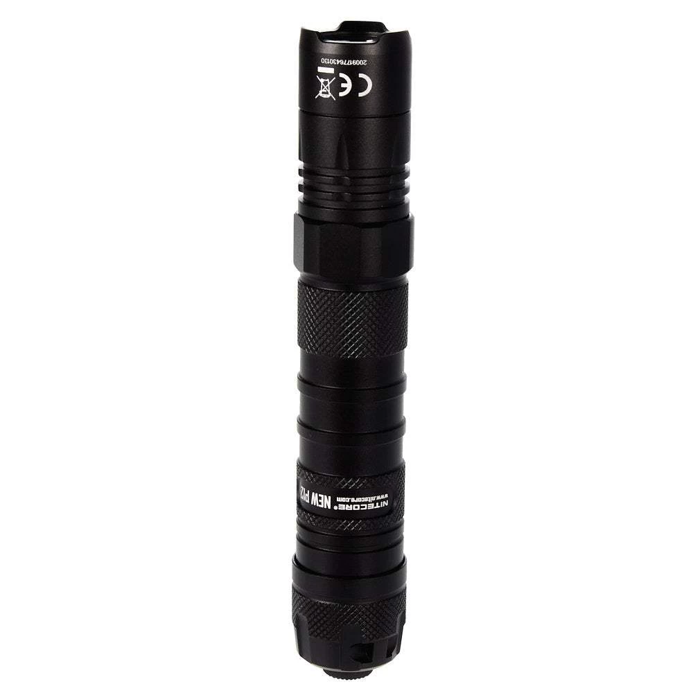 Batteries are NOT included. Requires either (1) 18650 battery or (20 CR123A batteries. This P12 Tatical Flashlight is overall 6.06 inches in length. It features a beam of 238m distance and SOS strobe. It is water resistant and impact resistant. The switch is a tailcap switch. There are several modes for the CREE CP-L HD V6 LED flashlight: High, Mid, Low, and Ultralow (lumens and runtimes vary pending mode). There is a tatical and daily mode and a power indacator switch. There is even an advanced temperature regulation module and electronic reverse polarity protection. This flashlight includes a tatical holser and 18650/CR123 battery magazine. Made of aluminum construction. Color is black. Made in China.