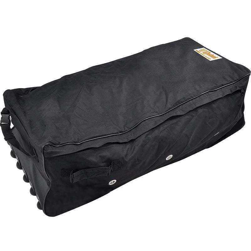 Made of tough, water resistant nylon, with two sizes to fit a two strand or three strand hay bale. Heavy duty zipper on three sides for easy loading. Also, heavy duty plastic wheels and nylon handle provide easy transport. Convenient side handles for loading in the truck. 44″ x 18″ x 15″
