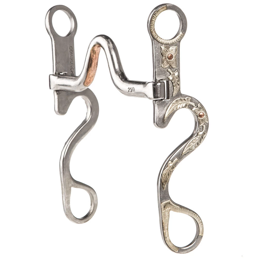 This Cowpuncher Cavalry Ported Bit is great fr correction and driving “whoa.” This bit can be severe if not used properly. Silver mounted cavalry shank bit. 7-3/4 shanks with copper overlayed on bottom side of port. 5-1/2 mouth, and 2 port.