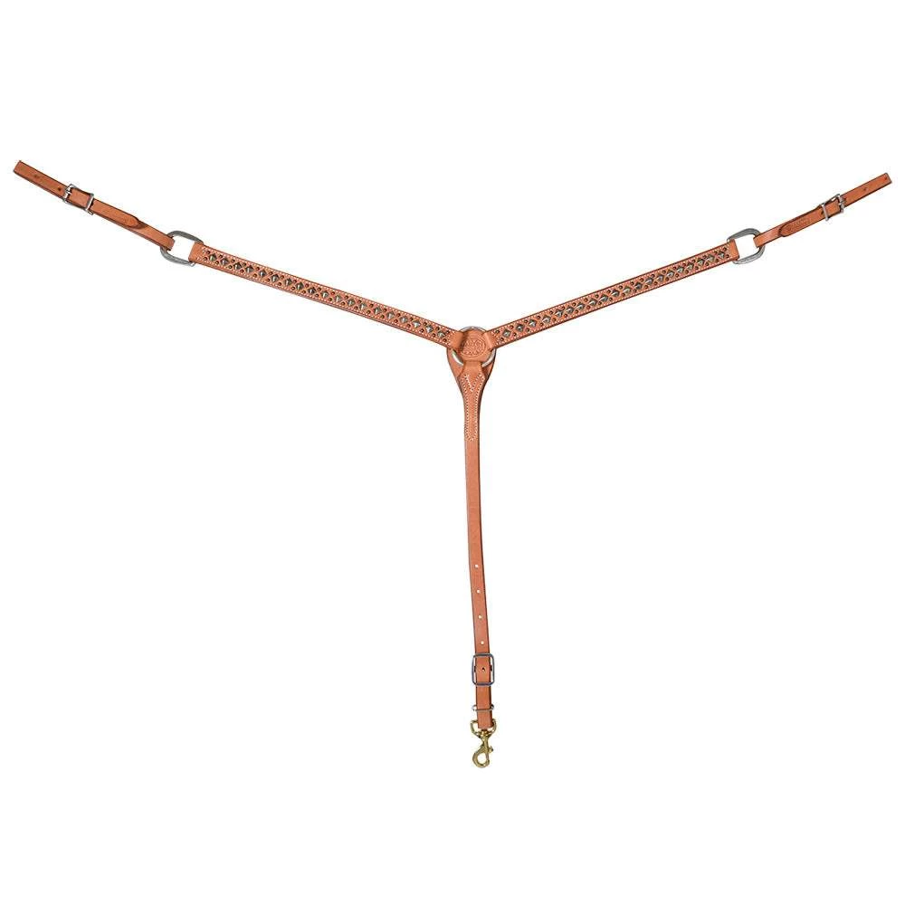 This Martin breast collar is constructed of natural skirting leather and features pewter pyramid dots. Stainless steel hardware.