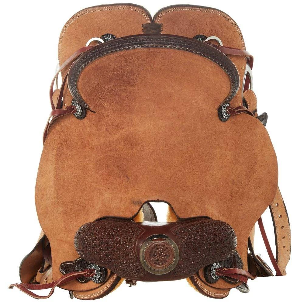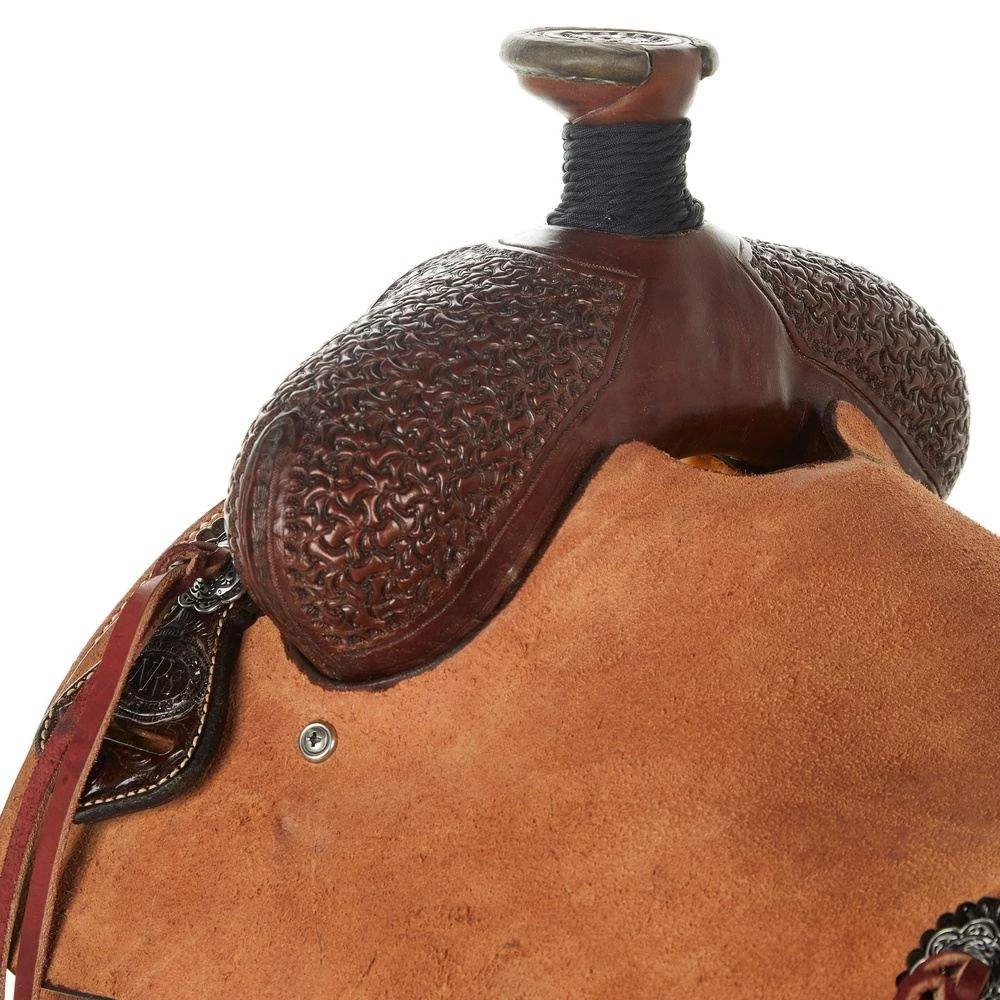 This NRS Competitor Series Ranch Roper has a lifetime warranty on the fiberglass covered wood tree, slotted conchos, 3″ rawhide bell stirrups, natural leather, a hard seat with rawhide Cheyenne Roll, and 90/10 wool blend lining. This saddle is built with a deep pocket for a comfortable ride all day.