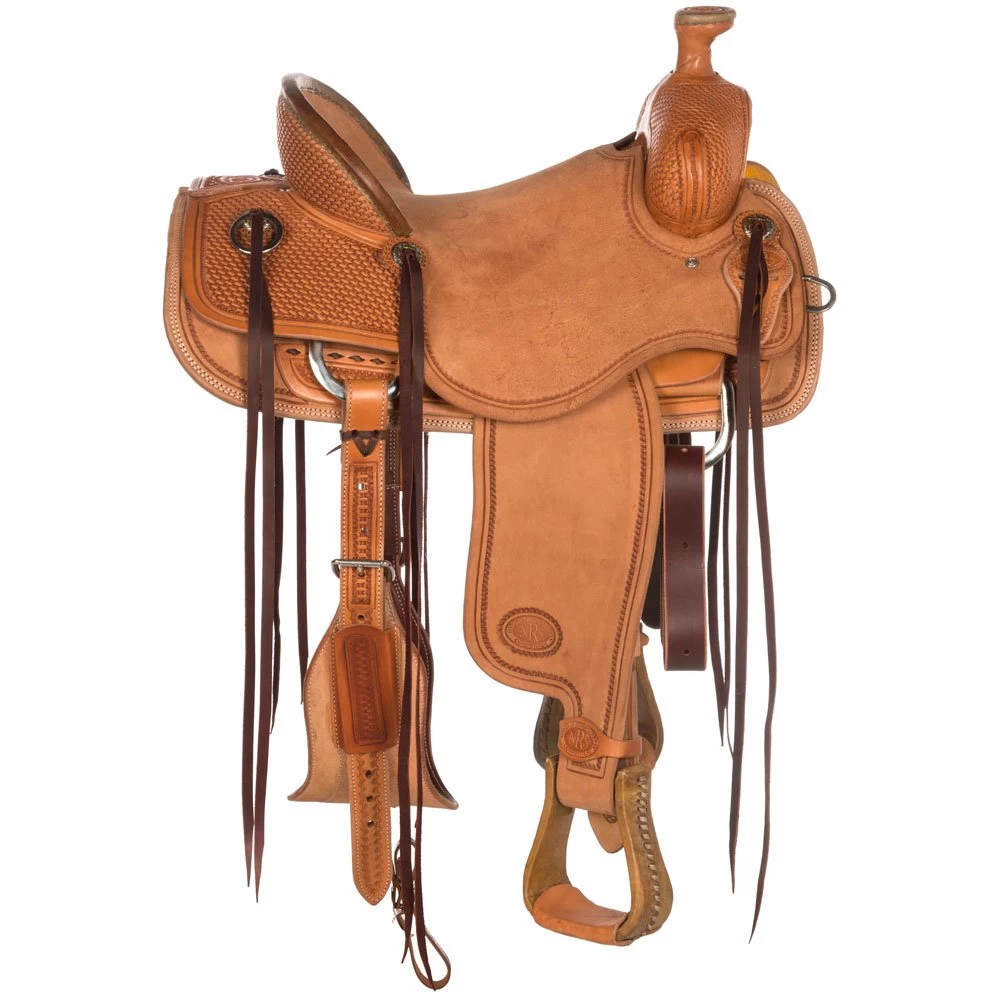 This NRS Competitor Series saddle is built with natural Herman Oak leather on our Olin Young Ranch Roper tree. This tree is rawhide covered wood and has a 6 ¾” gullet. The features of this saddle include basket stamp tooling, rawhide pencil roll, full wear leather, and a 90/10 wool blend lining.