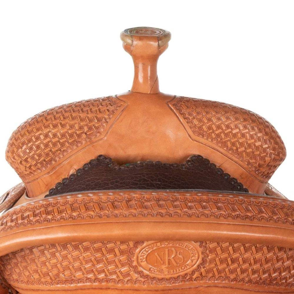 This NRS Competitor Series Team Roper has a 5 year warranty on the rawhide covered wood tree, silver floral berry conchos, metal bound wood roper stirrups, natural antiqued leather, front 7/8 drop rigging, a full toast suede quilted seat, and 90/10 wool blend lining. The seat pocket is constructed to help hold the roper in place and offer better balance effectively giving the roper every advantage.