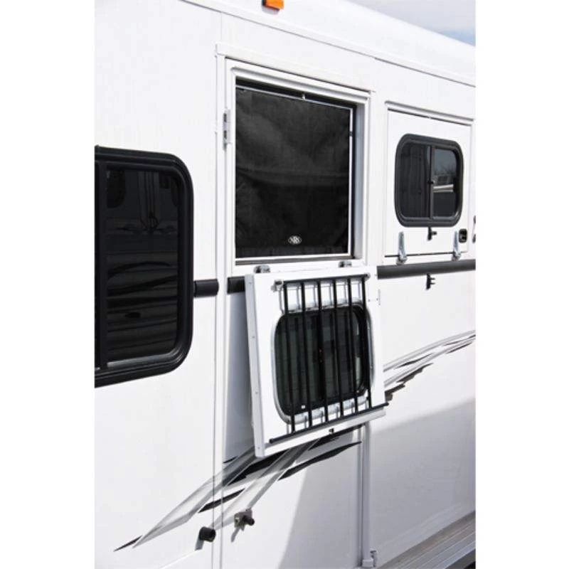 Professional’s Choice Horse Trailer Window ScreenKeeps debris, insects and dirt out and allows air to circulate to keep trailer well vented and cool. Complete with 4 double-ended snaps for easy installation.Size:35 x 26 Color: black
