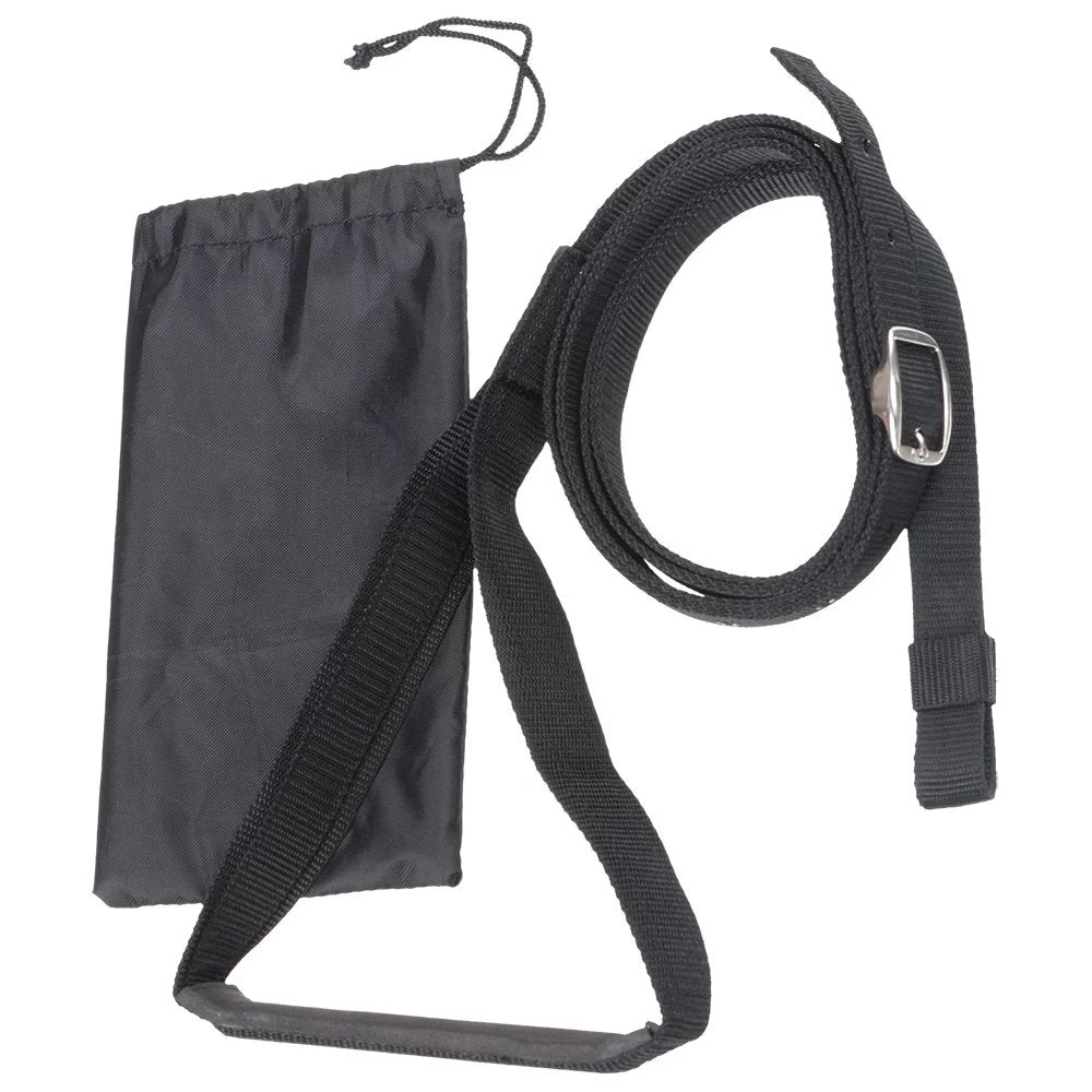 Strong nylon strap loops over horn and hangs below saddle stirrups to create an extra step to help when mounting your horse. Adjustable length. Easily folds into a 5” x 9” storage bag that can be tied to saddle or put in saddle bag