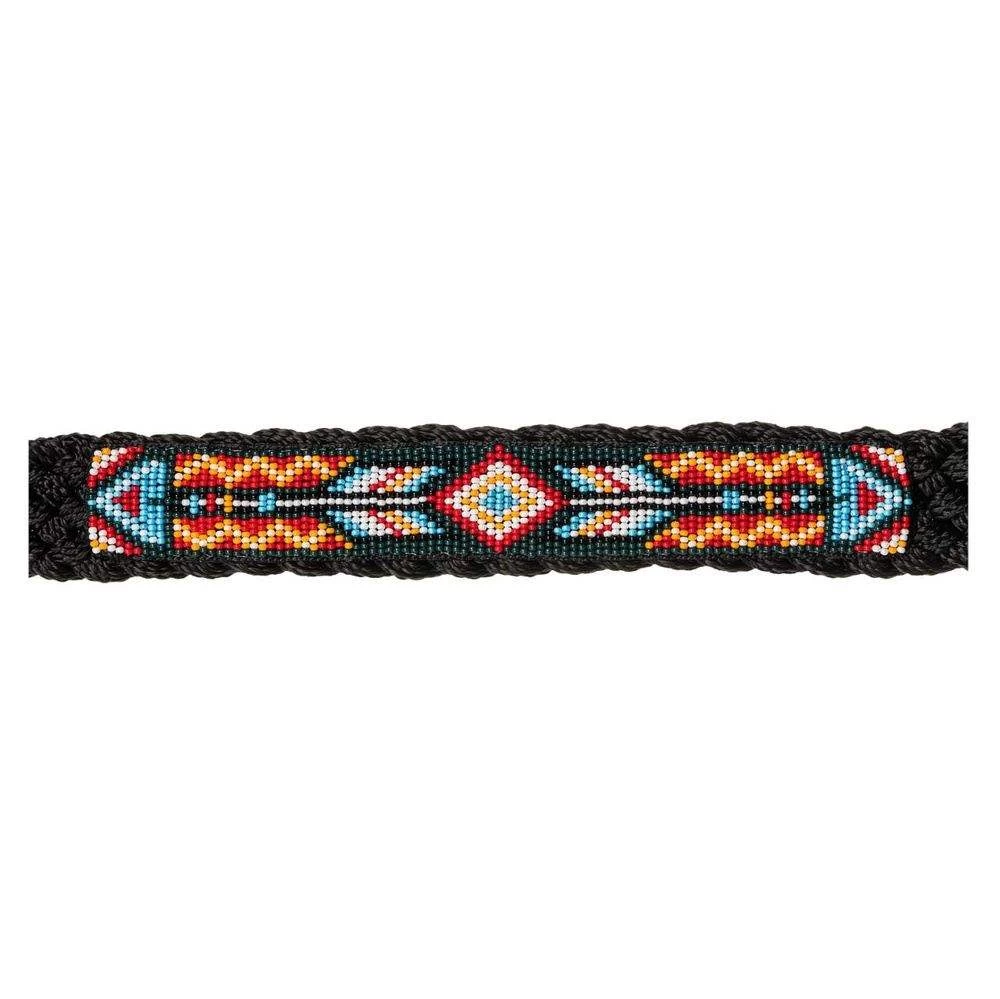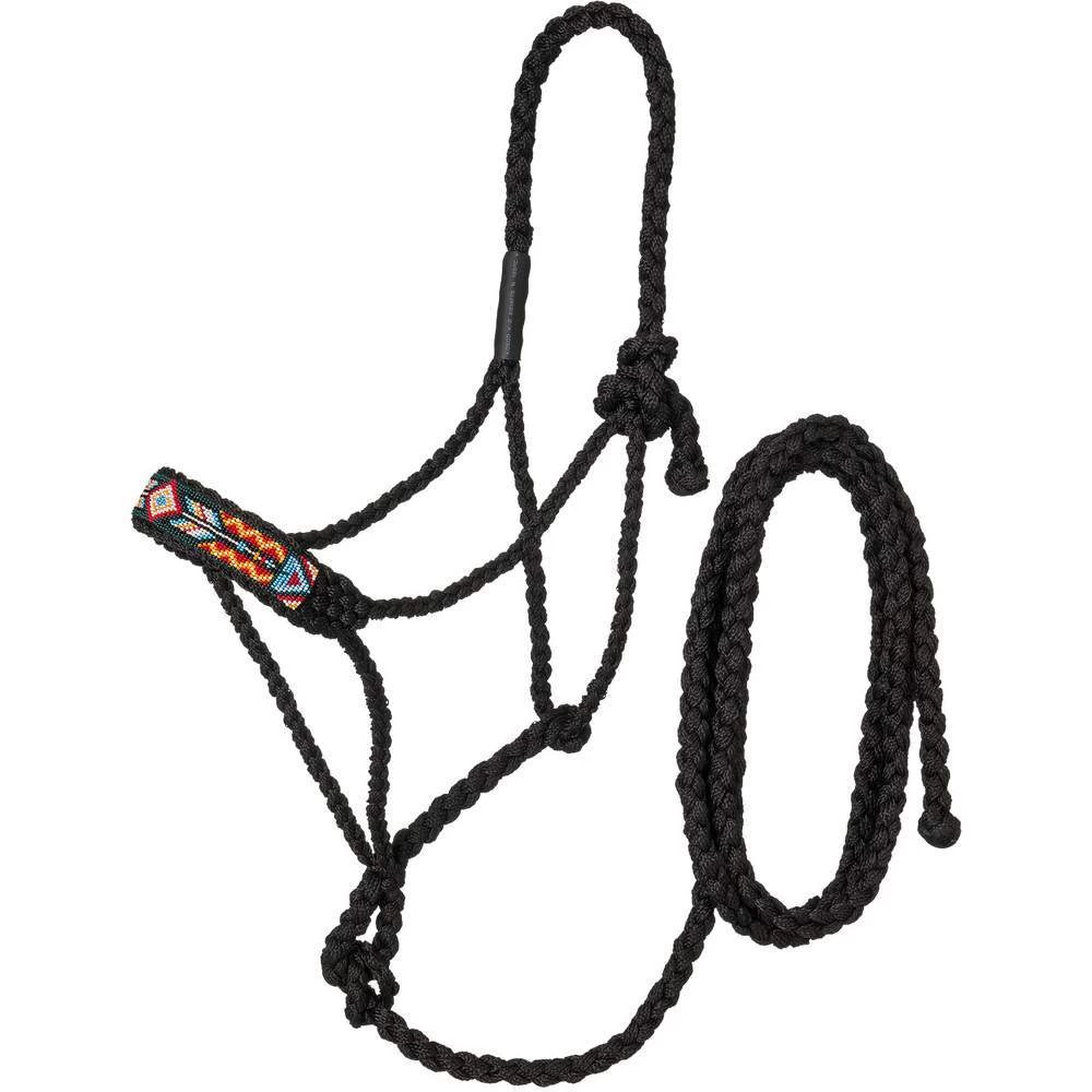 This Tough1 halter is lightweight but durable with soft plated nose and braided construction. The beaded nose adds some colorful western flair to the traditional mule tape halter design without compromising its strength. Includes 10ft removable lead rope great for those unexpected training moments. Loop end on lead rope allows option for adding a snap.